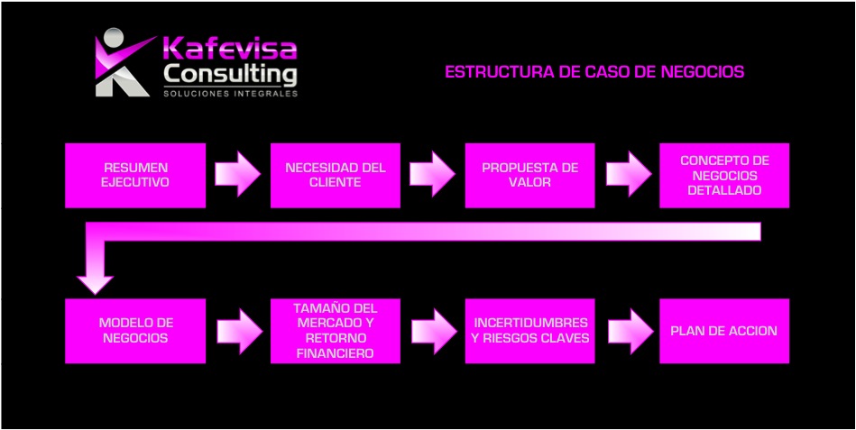 Hay ciertos elementos claves que debe incluir estos casos de negocio, los cuales pueden seguir el siguiente flujo: